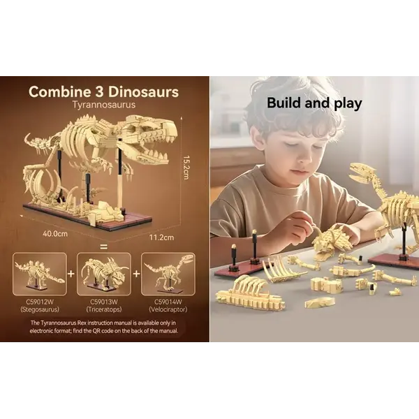 Les propriétaires des trois sets de dinosaures : C59012W Stégosaure, C59013W Tricératops et C59014W Velociraptor peuvent combiner les pièces pour les transformer en T-Rex.