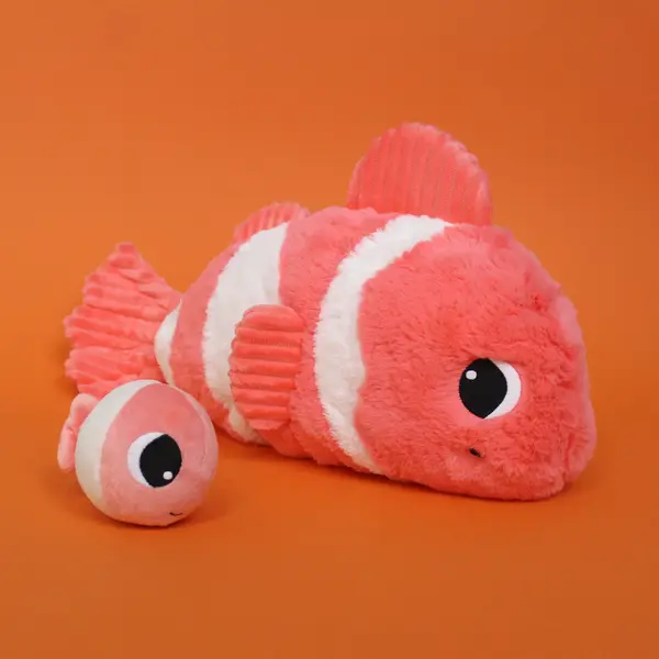 Ce poisson-clown blanc et corail de 38 cm est fabriqué en velours côtelé doux et en peluche. Et pour encore plus de câlins, un bébé poisson-clown est caché dans le ventre de la maman.