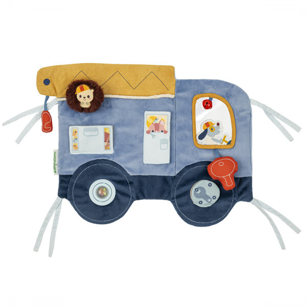 Vous cherchez des jouets pour le parc ? Jules le chien arrive avec son camion, ses outils et ses amis ! Tout pour stimuler les sens et divertir bébé, dès 3 mois. Au total, ce panneau d'éveil en tissu propose 6 activités. À l'avant du camion, notre chien bricoleur est debout sur un miroir pour s'observer et avec une clochette rouge à faire tinter. Indispensable pour commencer, le bouton rouge fait « tut » quand on appuie dessus : en route ! Sur les deux roues du camion, il y a un hochet à tourner et un volet à soulever pour découvrir des surprises. Au total, 3 panneaux s'ouvrent pour révéler tous les secrets de ce panneau de découverte. Mais attention aux bosses, car Léon le hérisson pourrait bien glisser des deux côtés du camion pendant le trajet vers le chantier ! Comme vous pouvez le constater, ce jouet d'éveil est placé sous le signe du bricolage, car c'est l'une des passions de notre cher Jules... Et bientôt peut-être celle de votre bébé ! Ce panneau d'activités lilliputien s'accroche facilement aux barreaux du parc ou du lit grâce à ses 4 sangles à nouer et peut également être posé au sol pour varier les positions des tout-petits pendant leurs moments de jeu. Avec ses différentes surprises visuelles, tactiles ou sonores, ses matériaux variés et colorés, ce jouet est un véritable atout pour l'éveil du bébé dès son plus jeune âge. Il développe sa motricité fine, sa vue, son ouïe, mais aussi sa réflexion, sa curiosité et son imagination : quelle mission de bricolage nos amis vont-ils accomplir ? Ce panneau en tissu mesure 41,5 x 30 cm et est lavable à la main. C'est parti, les enfants !