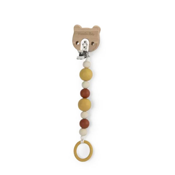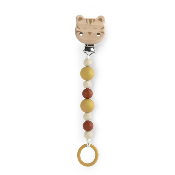 Attache-sucette en bois et silicone à motif tigre, pour ne plus perdre la sucette de votre bébé. Grâce à son clip réglable, vous pouvez la fixer à toutes les surfaces. Les perles en silicone sont sans danger pour les enfants, qui peuvent jouer avec et les mâchouiller sans souci.