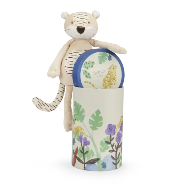 Baboo, le tigre un peu paresseux, est toujours prêt à faire un câlin. Avec ses formes rondes, son pelage couleur crème et ses rayures graphiques, il est le compagnon idéal des enfants. Il est présenté dans une boîte magnifiquement illustrée d'aquarelles d'Élodie Coudray.