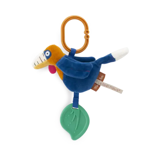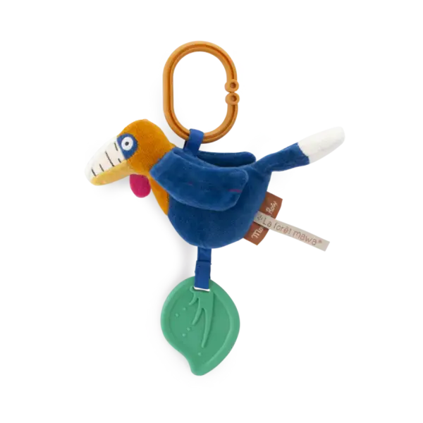 Oiseau rhinocéros coloré à suspendre, avec une clochette dans le ventre et des ailes qui craquent. Il est également équipé d'un jouet à mordre en forme de feuilles.