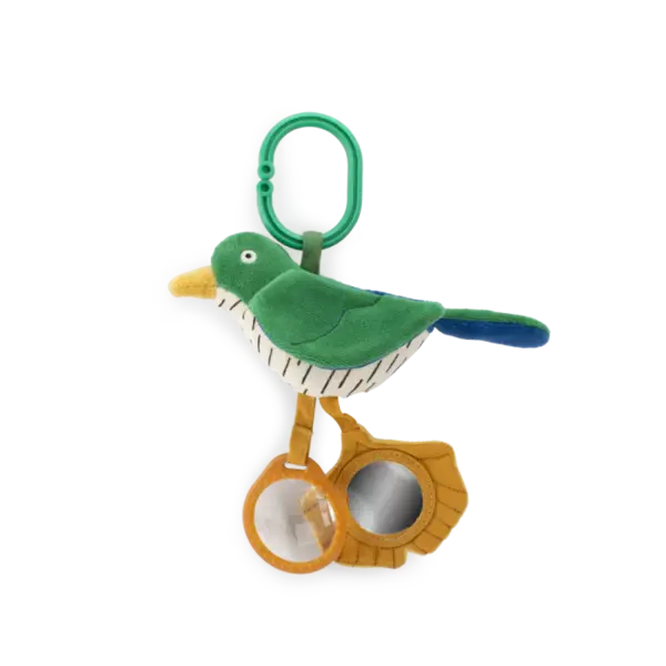 Coucou suspendu avec une clochette dans le ventre, équipé d'un miroir et d'une loupe. Il est habillé aux couleurs de la forêt Mawa et possède des ailes à frotter pour que les bébés puissent développer leurs sens tout en s'amusant !