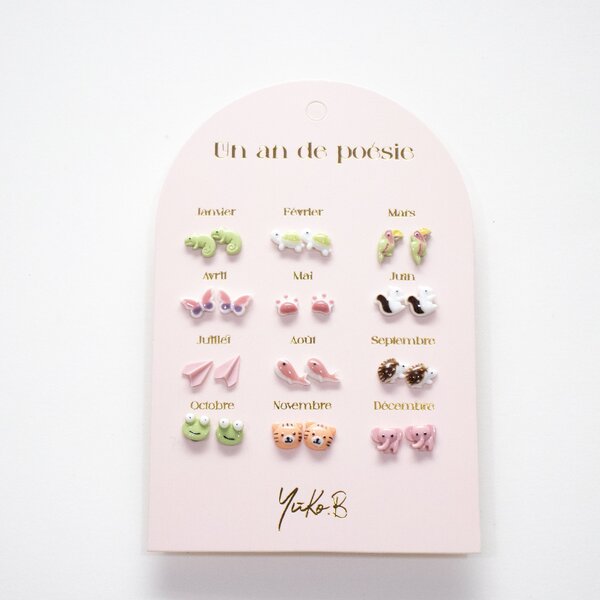 12 paires de boucles d'oreilles en céramique et en acier inoxydable, une paire par mois de l'année. Chaque ensemble est livré dans une belle enveloppe cadeau.