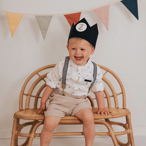 Avec la couronne d'anniversaire Korneel, chaque anniversaire devient une fête! Cette couronne d'anniversaire est faite à la main à partir de coton super doux et convient à tout âge. La couronne se ferme avec un velcro et est livrée avec 2 boutons numériques (coulissants) dorés sécurisés (1 et 2). Vous pouvez commander des chiffres supplémentaires séparément.