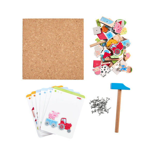 Hé, où est la vache ? C'est très simple : partout où les petits amateurs de ferme la placent ! À l'aide d'un gabarit ou selon leur propre inspiration, ils plantent des cochons, des brouettes et d'autres animaux et créent leur propre petit monde agricole. En fonction du niveau de difficulté du gabarit, des scènes et des bâtiments réalistes voient le jour. Chaque clou enfoncé est un petit succès qui renforce la confiance en soi.