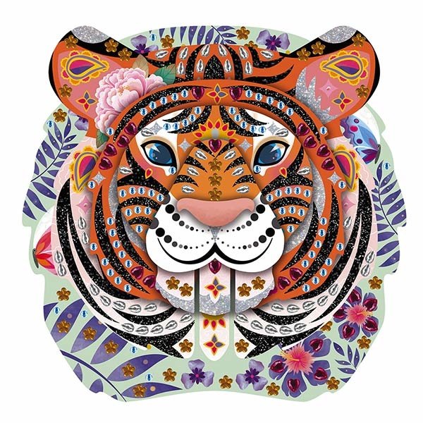 Avec ce kit créatif strass et paillettes trophée tigre, votre enfant pourra réaliser une magnifique tête de tigre en volume grâce aux 4 cartes prédécoupées à assembler et à customiser avec des paillettes et des strass. Un beau trophée pour décorer une chambre ! Ce kit contient : 4 cartes prédécoupées , 2 tubes de paillettes, 1 planche de strass, 1 planche d’autocollants, 1 outil en plastique et 1 livret avec modèles et instructions.