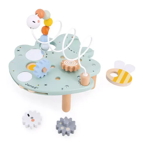 Cette fiche d'activités est un jouet d'éveil qui propose de nombreuses activités ludiques pour les bébés à partir de 18 mois. Au programme : motricité, observation et stimulation des sens ! Au total, 5 activités sont incluses : 4 engrenages à tourner et à retourner, 2 miroirs pour voir son reflet, 1 roue des couleurs, 1 loupe en forme d'abeille pour découvrir tous les petits insectes qui décorent la feuille et 1 boucle géante en forme de chenille avec des éléments coulissants.