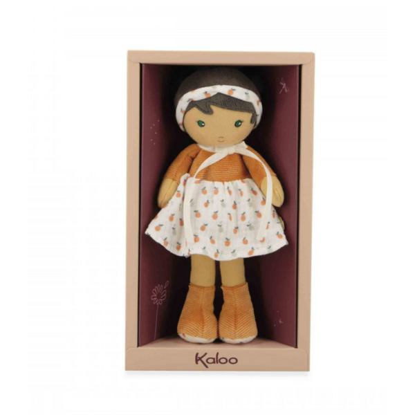 Découvrez Eloise, une adorable poupée en tissu de 25 cm au look rustique et estival. Elle fait partie de la collection de poupées Tendresse de Kaloo et convient aux bébés dès la naissance. Avec ses nattes espiègles, Eloise incarne la joie et la douceur de l'enfance ! Elle nous transporte dans un univers tendre et champêtre, fait de balades à la campagne et de rêveries sous les pommiers. Eloise porte un joli haut rayé qui lui donne une touche d'élégance. Grâce à ses chaussons assortis, elle peut se promener confortablement au soleil ! Eloise porte également une magnifique jupe en velours côtelé et en mousseline ornée de motifs fruités, qui rappellent la chaleur des journées ensoleillées et le plaisir de la récolte sous le soleil. Un bandeau délicat, assorti à sa jupe, met en valeur ses deux petits chignons et renforce son air joyeux et pétillant ! Elle est incroyablement douce et parfaite pour être tenue et câlinée par de petites mains. Eloise est facile à emporter partout et accompagne les enfants dans leurs aventures les plus tendres. Toujours prête à partager les moments du quotidien, elle deviendra une véritable compagne de jeu et une amie à câliner. Eloise évoque l'atmosphère des journées à la campagne : allongée dans l'herbe à regarder les nuages et cueillant des fruits mûrs au soleil. Un petit ruban cousu dans son dos permet d'écrire le nom du bébé, ce qui en fait une amie unique et précieuse. Livrée dans une jolie boîte, c'est un cadeau de naissance original, plein de douceur et de charme. Elle est également parfaite comme première poupée pour stimuler l'imagination d'un enfant. Le rembourrage est composé de polyester et de billes en plastique recyclé. Cette adorable poupée est lavable en machine et prête à être adoptée et aimée pour longtemps !