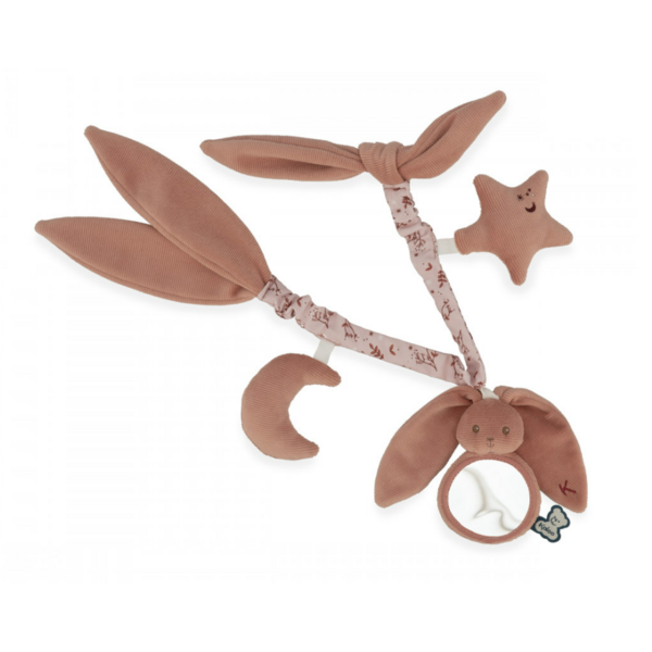 Bébé s'amusera beaucoup pendant les promenades avec cette guirlande d'activités Lapinoo ! Adaptée dès la naissance, elle est idéale pour proposer à bébé des jeux éducatifs stimulants lorsqu'il est dans sa poussette ou allongé dans sa chambre douillette. Le lapin en terre cuite est à l'honneur : grâce à ses grandes oreilles de chaque côté, vous pouvez suspendre le jouet pour bébé. Chaque jouet suspendu est conçu pour stimuler les sens de bébé lors de vos sorties : une lune en papier bruissant, un petit lapin en matière douce avec un miroir pour se regarder et une petite étoile à secouer. Oui, grâce aux grandes oreilles de nos lapins Kaloo, ils peuvent agiter la main vers le ciel étoilé ! Cette chaîne d'activités rose est fabriquée en velours côtelé, en popeline (polyester) et en rembourrage en polyester recyclé. Elle aide à développer le toucher, la vue et l'ouïe du bébé. Pratique et ultra-doux, c'est l'accessoire pour poussette qui accompagnera bébé dans toutes ses sorties. À la naissance, c'est toujours une bonne idée d'offrir un jouet d'éveil qui stimule le développement sensoriel de bébé ! Ce jouet portable est de couleur rose terracotta, mesure 40 cm de long et est entièrement lavable en machine à 30 °C.
