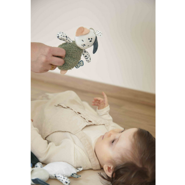 Trois petits chiots pour éveiller tous les sens de votre bébé ! Idéal dès la naissance, ce lot de trois chiots en peluche promet à votre enfant des heures de découvertes sensorielles. Avec leurs rubans permettant de les suspendre partout, ces petites peluches trouveront leur place sur le tapis d'éveil ou dans la poussette de votre bébé, prêtes à l'accompagner partout ! Avec leurs couleurs contrastées et leurs imprimés riches, ces jouets d'éveil sont aussi beaux que bien conçus pour le développement de votre bébé. Ils stimulent la motricité fine grâce à leur taille parfaitement adaptée aux petites mains ; ils stimulent la vue avec des imprimés à pois contrastés ; ils stimulent le toucher avec différentes textures ; et ils font découvrir à votre bébé de nouvelles sensations. Ils stimulent également l'ouïe grâce à du papier craquant qui intrigue et amuse votre tout-petit. Pour piquer encore plus leur curiosité, l'un des jouets est plus lourd et l'autre plus léger. Chaque chiot mesure 15 cm et possède ses propres caractéristiques uniques que votre bébé adorera découvrir ! Accrochez ces petites peluches en forme de chien et laissez votre enfant profiter de ces jeux sensoriels et évolutifs. Ce lot de 3 peluches sensorielles fait partie de la gamme Stimuli de KALOO, développée en collaboration avec des psychomotriciens pour aider les bébés à développer leurs capacités sensori-motrices dès la naissance. Ces peluches sont lavables en machine à 30 °C en cycle délicat et sont fabriquées en micro-velours, fausse fourrure, éponge et mousseline, avec un rembourrage en polyester recyclé.