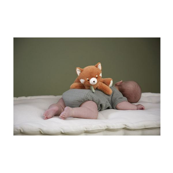 Voici une peluche lestée qui apporte réconfort et tranquillité aux tout-petits dès l'âge de 3 mois, juste avant le coucher ! Ce panda rouge de 26 cm, avec son pelage incroyablement doux, rassure les bébés en leur procurant une sensation réconfortante et enveloppante grâce à son poids d'environ 320 g, conçu pour être à la fois adapté et sûr. Cette présence douce et constante réduit l'anxiété et l'agitation avant le coucher. La peluche renforce également le rituel du coucher, car le bébé associe le panda à un moment calme et rassurant, ce qui aide à instaurer une routine. Cette présence familière est essentielle pour faire du coucher un moment vraiment serein. Le panda roux est calme et discret et aime se reposer paisiblement dans les arbres. Cette peluche s'inspire de cette sérénité pour offrir au bébé un compagnon rassurant. Outre son pelage incroyablement doux, les pattes du panda sont ornées de motifs végétaux qui rappellent la forêt verte où il vit, plongeant ainsi le bébé dans un univers naturel et apaisant. Un petit ruban vert, subtilement noué autour de son cou, invite le bébé à l'attraper et à stimuler ses sens. Grâce à sa forme ronde et à sa queue souple, le panda est facile à tenir, parfait pour les petites mains en quête de câlins. Cette peluche lestée est lavable en machine à 30 °C et est composée d'au moins 80 % de matériaux recyclés. Il fait partie de la collection Petit Songe : une gamme axée sur le sommeil, conçue pour créer une atmosphère douce et apaisante dans la chambre à coucher, avec des compagnons réconfortants qui accompagnent les bébés et les parents pendant le rituel du coucher.