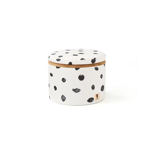 « Il est vraiment préférable que les petits enfants aient une vie un peu plus organisée. Surtout s’ils peuvent s’en occuper eux-mêmes ! » — Fifi Brindacier Ce pouf doit son motif ludique au cheval de Fifi — une monture robuste au pelage tacheté remarquable. Le tissu à pois est associé à une longue frange sur un côté, clin d’œil à la queue qui se balance du cheval. L'intérieur du pouf est recouvert de tissu noir et offre un espace de rangement pratique pour les petits trésors ou les objets du quotidien. Il a exactement la bonne taille pour servir de tabouret, de table de chevet ou d'endroit où s'asseoir un instant pour enfiler ses chaussettes — pas besoin d'écurie.