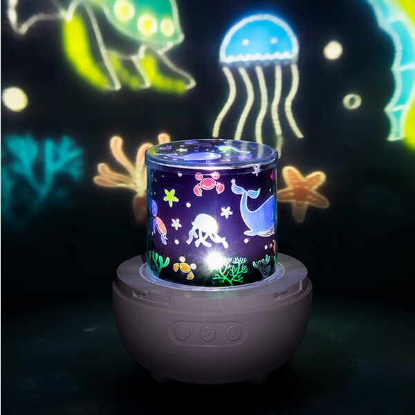 Projecteur lumineux et musical. Divers effets lumineux : jaune, bleu ou couleurs changeantes. 3 motifs de projection : espace, océan et fleurs. 8 mélodies différentes. Rechargeable via USB C. Dès la naissance.