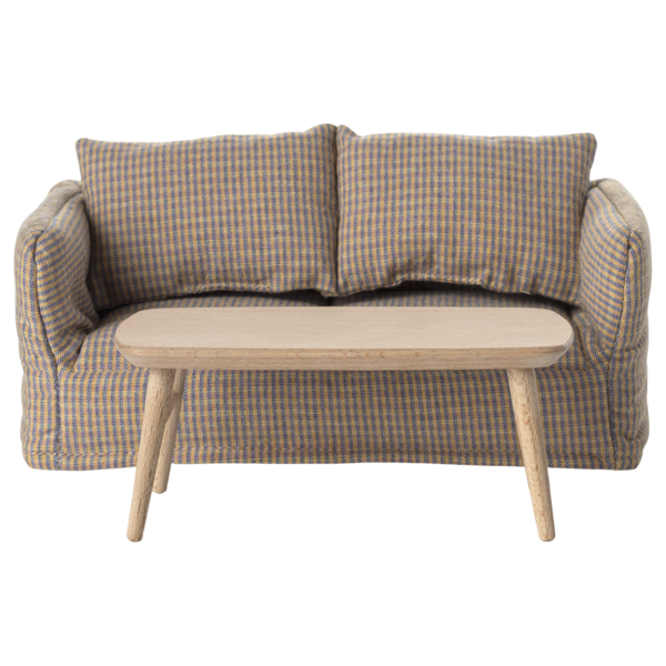 Une table basse en bois qui s'harmonise parfaitement avec les canapés de la taille d'une souris. Cette table peut être utilisée dans la ferme Mouse Hole et est certainement l'endroit idéal pour des réunions conviviales autour d'un thé ou d'un café.