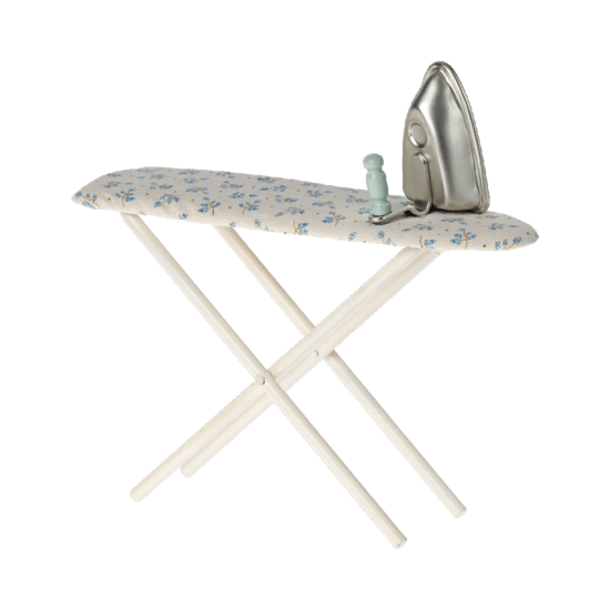 Avec cette planche à repasser avec fer, tous les vêtements de vos souris et lapins Maileg sont bien repassés. La planche à repasser en métal avec une belle couverture florale est pliable, tout comme une vraie planche à repasser.