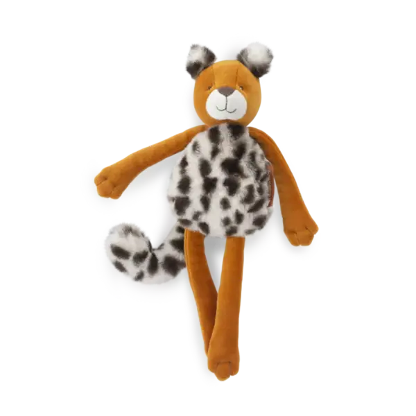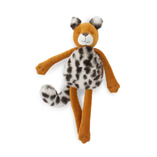 Hochet léopard Taïgo avec de longues pattes faciles à attraper et un corps doux à câliner. Grâce à sa clochette, bébé peut le secouer et jouer au rythme de la musique !
