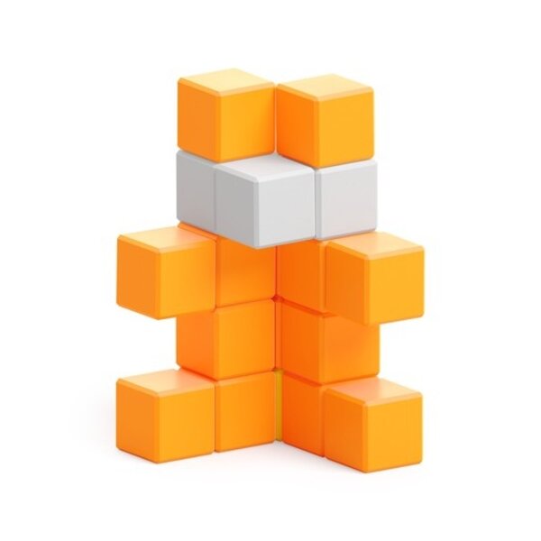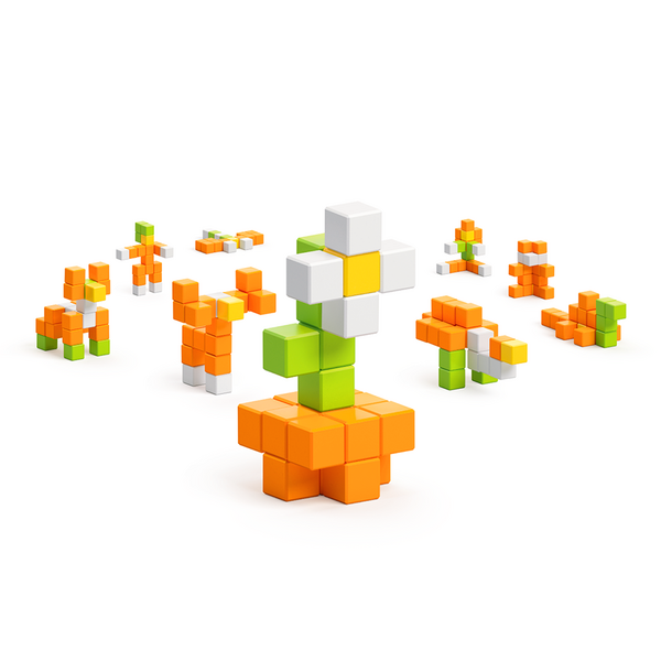 Vous recevez 24 cubes PIXIO en 4 couleurs pour créer une fleur raffinée, une femme, un petit ours en peluche, un lémurien rigolo et un chameau entièrement orange.