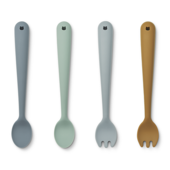Set de 4 couverts en silicone souple La phase de transition vers l'apprentissage de la nourriture solide n'est pas toujours facile. Le set de couverts pour bébé Shea est un set facile à utiliser pour les repas quotidiens, fabriqué en silicone souple, sans danger pour votre enfant et silencieux si vous le laissez tomber. Pratique pour les repas quotidiens qui ne sont pas si faciles à préparer - et un peu plus doux pour les oreilles et les yeux de tout le monde.