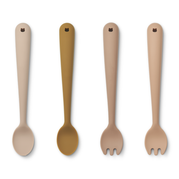 Set de 4 couverts en silicone souple La phase de transition vers l'apprentissage de la nourriture solide n'est pas toujours facile. Le set de couverts pour bébé Shea est un set facile à utiliser pour les repas quotidiens, fabriqué en silicone souple, sans danger pour votre enfant et silencieux si vous le laissez tomber. Pratique pour les repas quotidiens qui ne sont pas si faciles à préparer - et un peu plus doux pour les oreilles et les yeux de tout le monde.