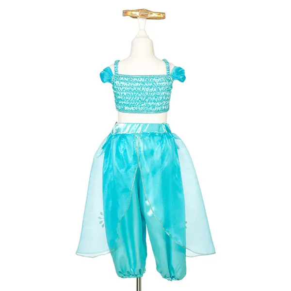 La princesse Amira adore danser. Avec sa magnifique tenue bleu turquoise et son bandeau assorti, elle montre ses talents de danseuse ! La tenue Amira est 100 % polyester et existe en trois tailles : taille 3-4 ans (98-104 cm). Longueur du pantalon : 48 cm, longueur du haut : 25 cm. Taille 5-7 ans (110-122 cm). Longueur du pantalon : 63 cm, longueur du haut : 29 cm. Taille 8-10 ans (128-140 cm). Longueur du pantalon : 76 cm, longueur du haut : 33 cm. Le bandeau est réglable à l'aide d'une bande Velcro.