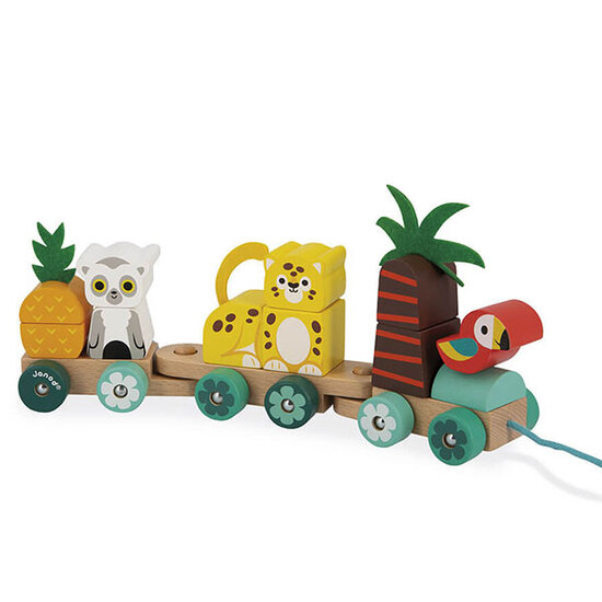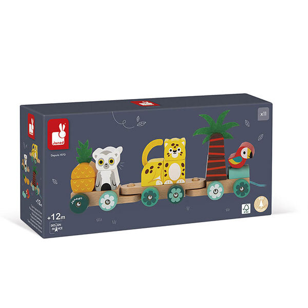 Faire de la place! Le train tropical à tirer avec des animaux tropicaux de la collection Janod Tropik arrive! Le perroquet, le léopard et le singe lémurien adorent se promener et jouer avec votre enfant. Ce joli train en bois est un merveilleux jouet d'activité 2 en 1. Par exemple, les enfants développent d'abord leur motricité fine grâce aux blocs de bois et aux belles couleurs et en tirant le train vers l'avant avec la ficelle en coton. Les enfants s’amusent ensuite à empiler et reconstituer les différents blocs de bois. Ce magnifique train à tirer est idéal pour développer la motricité fine et l'apprentissage des couleurs et des animaux dès 12 mois.