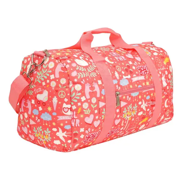 Deze weekendtas met prachtig Fun design is een ruime en praktische reistas voor een slaapfeestje of om mee op reis te nemen. De tas heeft twee handvatten en een verstelbare en afneembare schouderriem, een ruim hoofdcompartiment met extra vakje, twee zijvakken en een vak met rits voorop. De weekentas is gemaakt uit sterk polyester, licht van gewicht en onderaan afgewerkt met beschermende noppen.