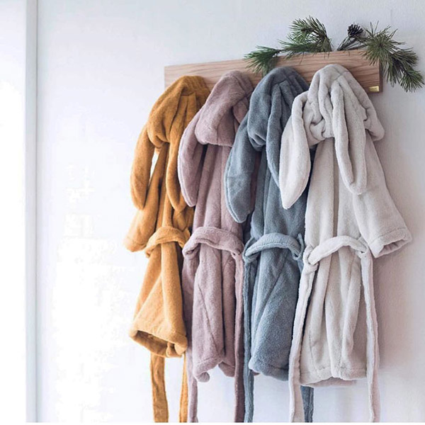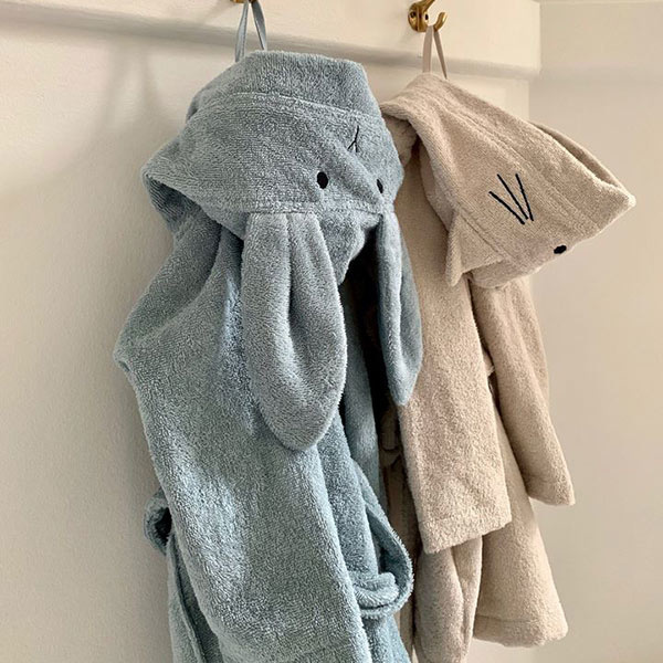 En als kers op de taart een badjas gemaakt uit terry katoen in drie verschillende kleuren met toffe konijnenoren voor een extra schattigheid factor!