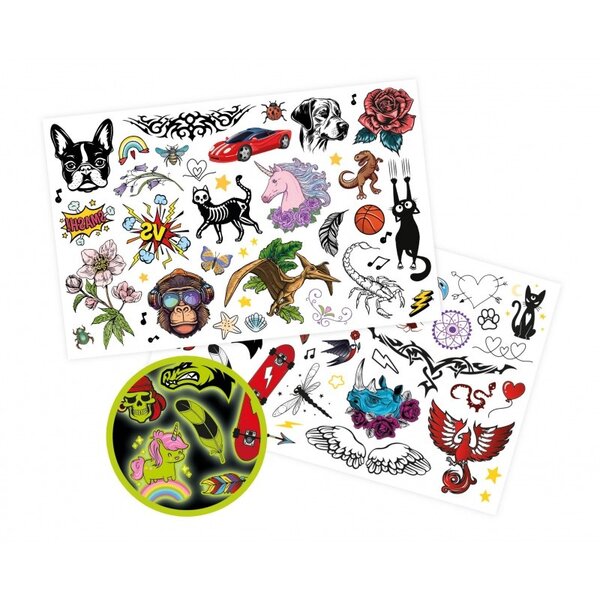 Er worden ook 4 vellen tijdelijke tatoeages meegeleverd voor kleurrijke tatoeages die oplichten in het donker.