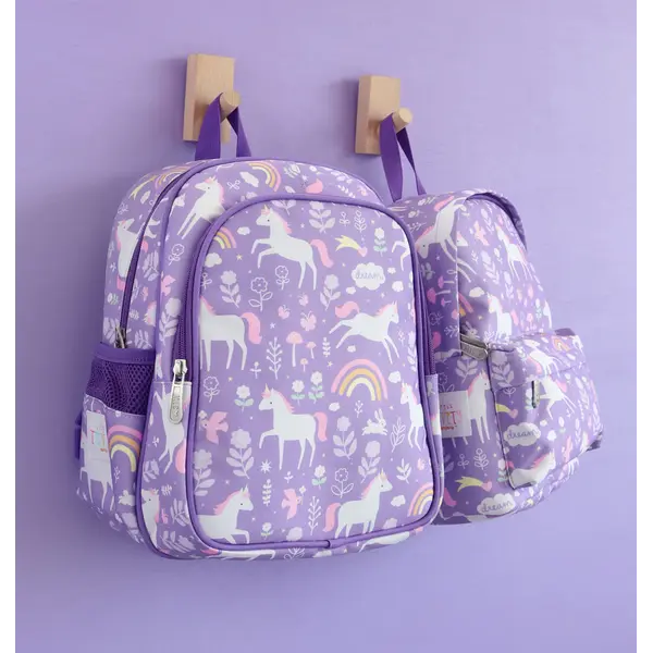 De handige, paarse rugzak met eenhoorns, bloemetjes en regenbogen is ideaal om mee te nemen naar school of op reis. De kinderrugzak heeft een ruim hoofdcompartiment, een geïsoleerd voorvak en twee open zijvakken; groot genoeg voor een broodtrommel, een snack en een drinkfles. De rugzak is voorzien van gevoerde schouderbanden en een borstriem, zodat hij niet snel van de schouders afzakt. Het rugpaneel is gevoerd met een luchtdoorlatende stof voor extra comfort.