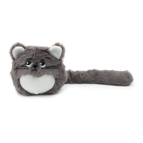 De grijze Ptipotos kattenpluche wordt verkocht met de baby verborgen in de buik.