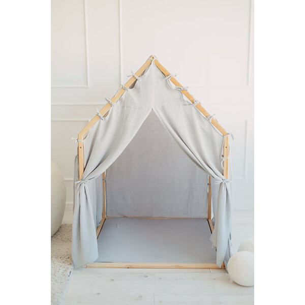 Het huisje is bedekt met een hoogwaardige, luchtige cover van 100% mousseline katoen (Oeko-Tex 100 gecertificeerd), die losjes over het dak ligt en tot aan de vloer reikt. De achterkant is volledig gesloten met een stoffen wand in dezelfde kleur. Aan de voorkant zorgt een stijlvolle split in het midden voor een speelse ingang. Deze opening reikt niet helemaal tot bovenaan, waardoor het geheel een knusse, tentachtige uitstraling behoudt. De twee stoffen panelen kunnen met striklinten opzij gebonden worden – net als gordijnen – om het huisje gedeeltelijk open te zetten.