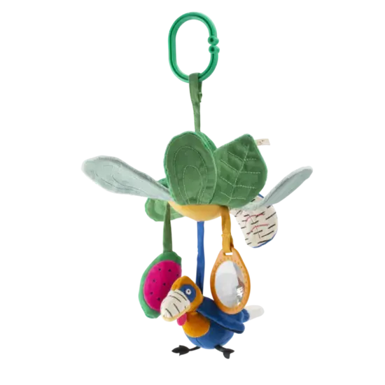 Bloemvormige hangspeeltjes in verschillende kleuren, patronen en texturen. Baby's kunnen met de neushoornvogel en de watermeloen rammelen, met de knisperende bloemblaadjes spelen en de wereld door het prisma bekijken. Op naar nieuwe ontdekkingen!