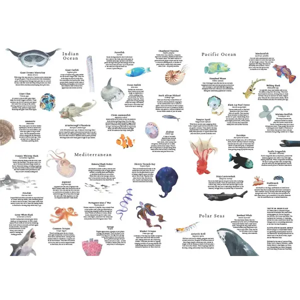 Ontdek de oceaan met meer dan 50 prachtige zeedieren in deze rijk geïllustreerde puzzel van 1000 stukjes.