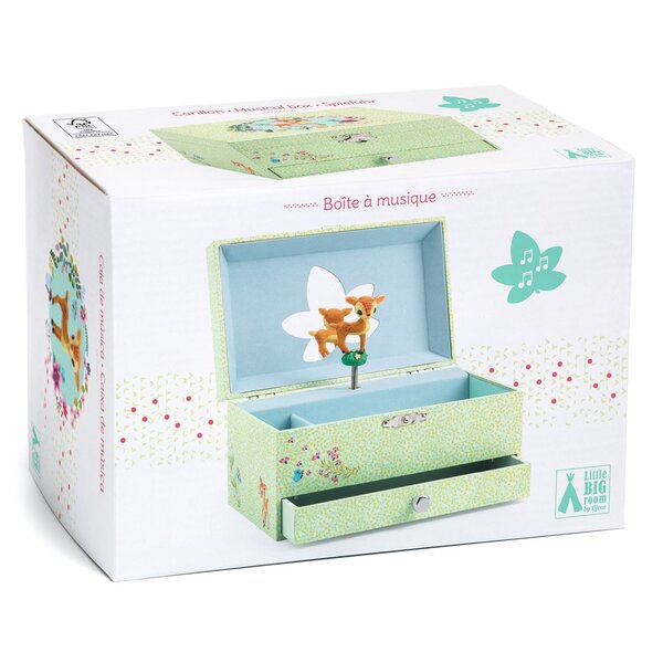 Een lief Bambi muziekdoosje en juwelendoos in één, naar een prachtig design van Djeco.