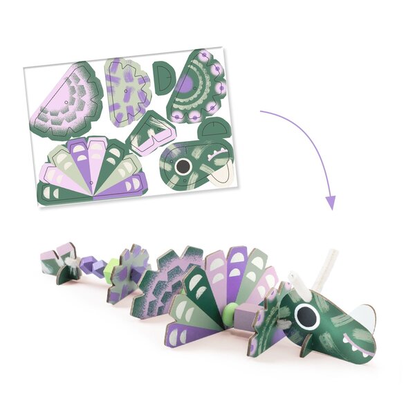 Een originele activiteit om 3 schattige én angstaanjagende dinosaurussen tot leven te brengen! Het kind rijgt houten kralen en voorgesneden elementen van dik karton aan de chenilledraad om zijn eigen modellen te maken. Een activiteit die de creativiteit, fijne motoriek en verbeelding stimuleert, met eindeloze mogelijkheden om de elementen te combineren en je eigen dinosaurussen te ontwerpen.