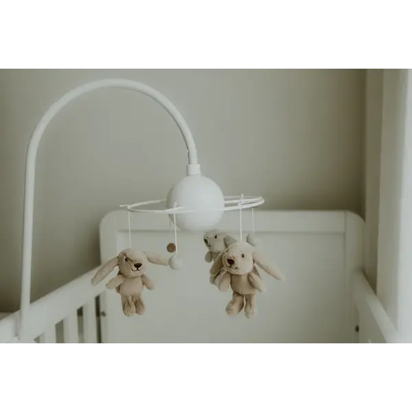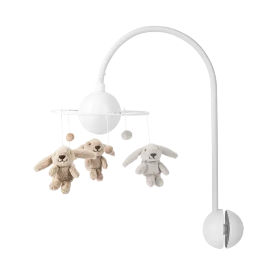 Deze Milo boxmobiel is een hippe mobiel die je baby kan kalmeren door de lieve melodietjes en zijn leuke konijnen vriendjes. Je kan kiezen uit vier verschillende melodieën, Mozart en Meditatie zijn onze favorieten! De mobiel heeft een optionele timer functie waarbij je kunt kiezen uit 15 en 30 minuten. Hij is oplaadbaar en komt met een afstandsbediening. Naast dat de mobiel er leuk uit ziet en leuke melodietjes heeft, is deze ook goed voor de visuele ontwikkeling van je baby! Kijk naar de product video om een nog beter beeld te krijgen van de mobiel en alle melodietjes te beluisteren!