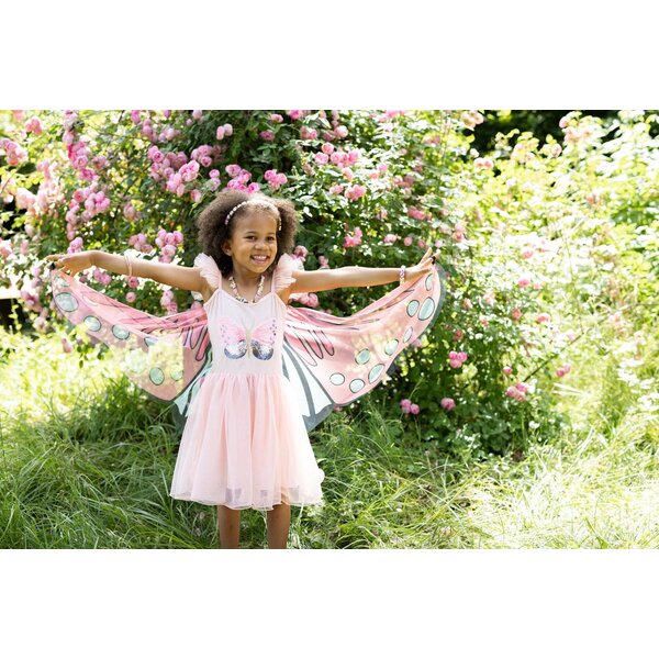 De jurk is ontworpen in een tanktop stijl en heeft delicate tule bij de bandjes om grillige kapmouwtjes te creëren, die zowel elegantie als comfort bieden. De jurk is compleet met prachtige geprinte vlindervleugels van mesh, voorzien van vingerlussen waardoor ze fladderen en flapperen bij elke beweging.