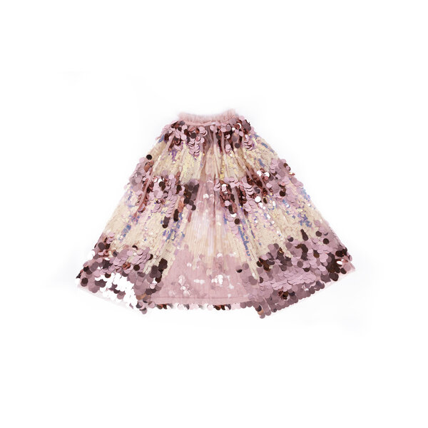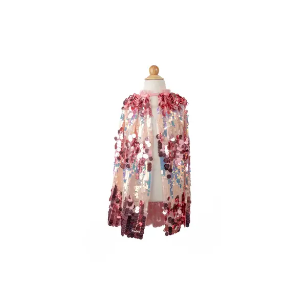De cape is afgewerkt met een delicate tule kraag, die een zachte, elegante touch toevoegt aan de gedurfde pailletten. Een handige klittenbandsluiting bij de hals zorgt voor een veilige en comfortabele pasvorm. Of het nu voor een kostuum, optreden of gewoon om wat glamour toe te voegen aan alledaagse avonturen is, deze cape brengt betoverende elegantie in de garderobe van je kleintje.