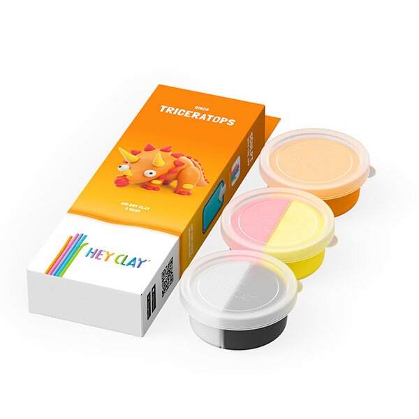 Met deze set bestaande uit 3 potjes boetseerklei van Hey Clay, boetseer je aan de hand van de bijhorende app een vrolijke Triceratops. Boetseren was nog nooit zo leuk en gemakkelijk! Volg de eenvoudige instructies via de animaties op de app om de personages tot leven te laten komen. De app toont stap voor stap welke kleuren er nodig zijn en hoe de losse onderdelen te boetseren. Met de kleuren op de verpakking maak je alle personages uit de set. Een deel van de klei blijft over voor hergebruik en bewaar je in een afgesloten doosje tegen uitdroging.
