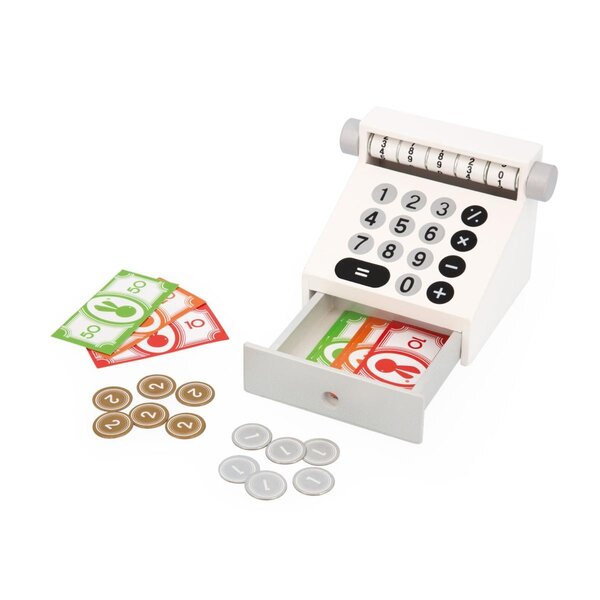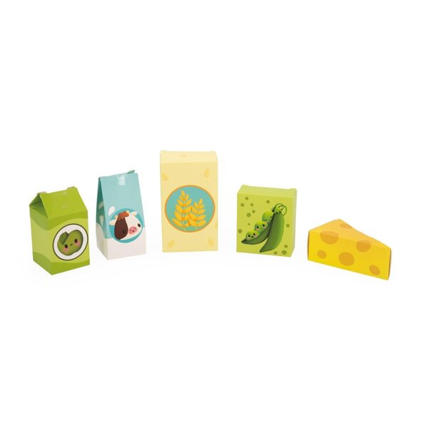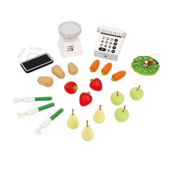 De markt is open! Kom en ontdek dit charmante winkeltje, perfect voor beginnende winkeliers. Met de houten winkel 'Boerenmarkt' kunnen kinderen vanaf 3 jaar hun eigen winkeltje bedenken en creëren. Dit prachtige speelgoed is uitgerust met een klok, een krijtbord om rekeningen of openingstijden op te schrijven, een doos krijt, 5 kartonnen voedseldozen (erwten, bloem, melk, appelsap en kaas), een weegschaal en een kassa met speelgeld en muntjes om te betalen! In de vakjes van de houten winkel kan je kind de meegeleverde groenten en fruit (3 appels, 3 peren, 3 aardbeien, 3 wortels, 3 preien en 3 aardappelen) plaatsen en de prijs van elk artikel op het krijtbord voor elk vakje schrijven. Net als volwassenen is er kraftpapier beschikbaar om de groenten in te wikkelen voordat ze aan de klant worden gegeven. En voor degenen met een grotere eetlust en een volle tas, zijn er twee milieuvriendelijke boodschappentassen van netstof! Handig is dat er drie houten haakjes aan de winkel bevestigd zijn om tassen of andere accessoires aan op te hangen. Dit houten speelgoed bevat in totaal meer dan 32 accessoires, goed voor uren speelplezier met het verkopen van groenten en fruit! FSC™-gecertificeerd houten speelgoed. Geschikt voor kinderen vanaf 3 jaar.
