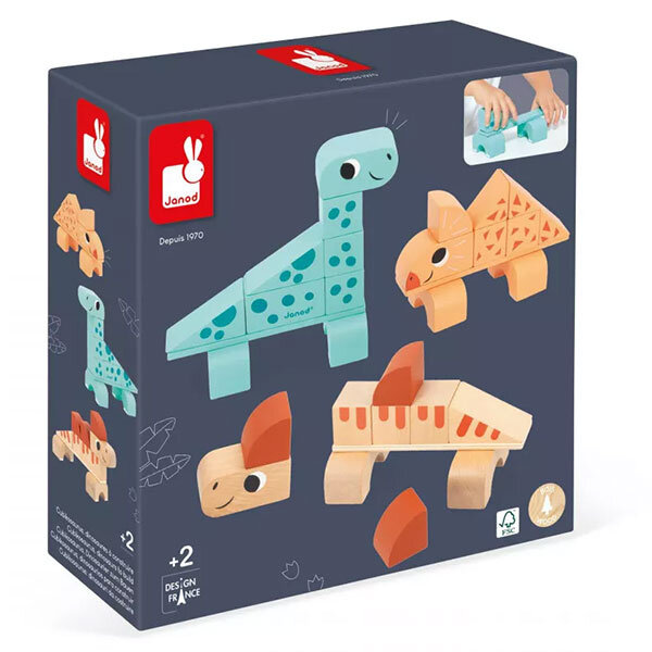 - Inhoud: 32 verschillende houten blokken waarmee je 3 dino's bouwt. De Diplodocus is 15 x 18 x 6 cm. Kaarten met voorbeelden.
