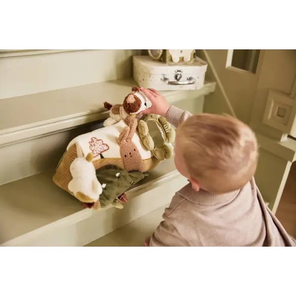 Deze schattige activiteiten driehoek uit de Tiny Park collectie is een must-have voor de box van je baby. Het kussen is versierd met vrolijke borduursels van een hondje en een konijntje, wat zorgt voor een speelse uitstraling. De driehoek bevat diverse attachments, waaronder een spiegel die ideaal is voor tummy time. Met zijn zachte materialen en leuke details biedt deze activiteiten driehoek uren speelplezier en draagt hij bij aan de ontwikkeling van je kleintje. Een perfecte aanvulling op de Tiny Park collectie!