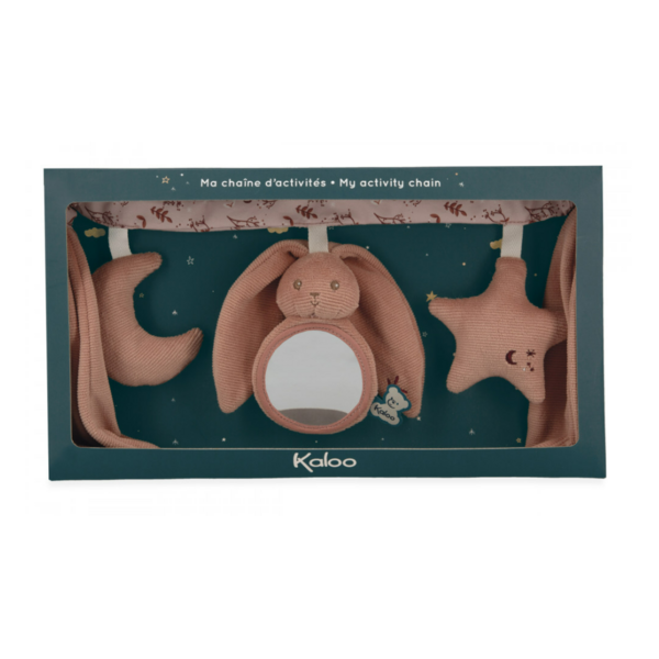 Baby heeft veel plezier tijdens wandelingen met deze Lapinoo-activiteitenslinger! Geschikt vanaf de geboorte, ideaal om baby stimulerende educatieve spelletjes aan te bieden wanneer hij in zijn kinderwagen zit of in zijn knusse kamer ligt. Het terracotta konijn staat in de schijnwerpers: dankzij de grote oren aan beide kanten kun je het babyspeeltje ophangen. Elk hangend speeltje is ontworpen om de zintuigen van de baby te prikkelen tijdens uitstapjes: een maan met ritselend papier, een klein konijntje van zacht materiaal met een spiegel om zichzelf in te bekijken en een sterretje om mee te rammelen. Ja, dankzij de grote oren van onze Kaloo-konijntjes kunnen ze naar de sterrenhemel zwaaien! Deze roze activiteitenketting is gemaakt van corduroy, popeline (polyester) en gerecyclede polyester vulling en helpt de tastzin, het gezichtsvermogen en het gehoor van de baby te ontwikkelen. Praktisch en superzacht, het is het accessoire voor de kinderwagen dat de baby op al zijn uitstapjes vergezelt. Bij een geboorte is het altijd een goed idee om een activiteitenspeeltje te geven dat de zintuiglijke ontwikkeling van de baby stimuleert! Dit draagbare speeltje is terracottaroze van kleur, 40 cm lang en volledig machinewasbaar op 30°.