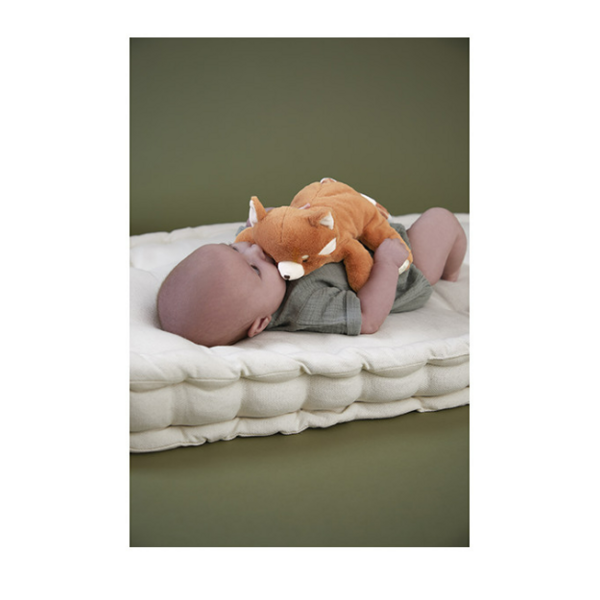 Hier is een verzwaard knuffeldier dat troost en rust brengt aan kleintjes vanaf 3 maanden, net voor het slapengaan! Deze 26 cm grote rode panda, met zijn ongelooflijk zachte vacht, stelt baby's gerust door een troostend, omhullend gevoel te bieden dankzij zijn gewicht van ongeveer 320 g, ontworpen om zowel geschikt als veilig te zijn. Deze zachte en constante aanwezigheid vermindert angst en onrust voor het slapengaan. Het knuffeldier versterkt ook het bedtijdritueel, omdat de baby de panda associeert met een rustig en geruststellend moment, wat helpt om een routine op te bouwen. Deze vertrouwde aanwezigheid is essentieel om van het slapengaan een echt sereen moment te maken. De rode panda is kalm en discreet en houdt ervan om vredig in de bomen te rusten. Dit knuffeldier is geïnspireerd door deze rust om de baby een geruststellende metgezel te bieden. Naast zijn ongelooflijk zachte vacht zijn de pootjes van de panda versierd met plantmotieven die doen denken aan het groene bos waar hij leeft, waardoor de baby wordt ondergedompeld in een natuurlijke en rustgevende wereld. Een klein groen lintje, dat subtiel om zijn nek is geknoopt, nodigt de baby uit om het vast te pakken en zijn zintuigen te prikkelen. Door zijn ronde vorm en zachte staart is de panda gemakkelijk vast te houden, perfect voor kleine handjes die op zoek zijn naar knuffels. Dit verzwaarde knuffeldier is machinewasbaar op 30 °C en is gemaakt van minimaal 80% gerecyclede materialen. Het behoort tot de Petit Songe-collectie: een op slaap gericht assortiment dat is ontworpen om een zachte en rustgevende sfeer in de slaapkamer te creëren, met troostende metgezellen die baby's en ouders begeleiden tijdens het bedtijdritueel.