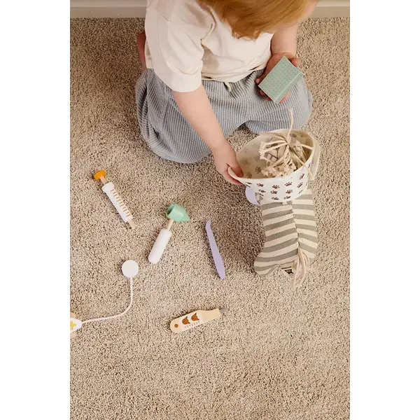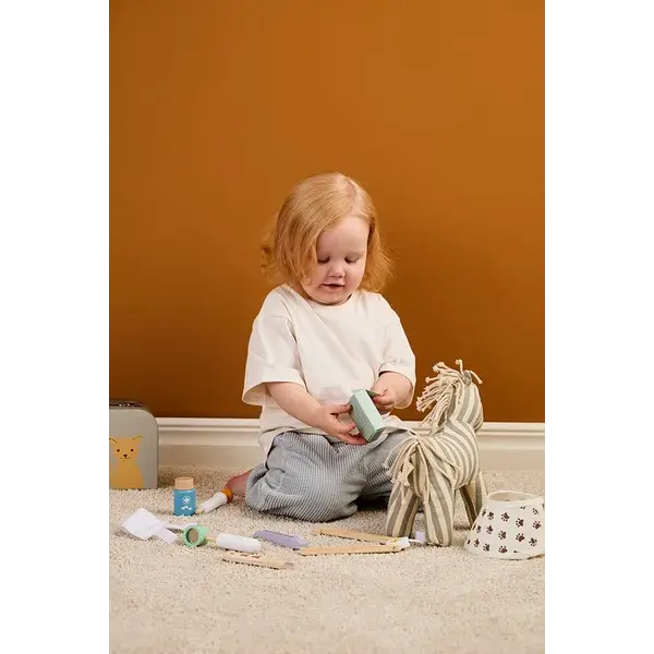 Kom maar op – de dierenarts is er! Maak je harige vriendjes klaar voor hun jaarlijkse controle. Deze dierenartsset is gemaakt voor kinderen die graag voor hun knuffelvriendjes zorgen. De set bevat een spuit, een medicijnflesje, „kattenvoer“ in de vorm van visjes, een stethoscoop, een thermometer, een pincet en een stoffen kraag om te voorkomen dat huisdieren na een operatie aan hun wonden likken. Er zit ook een oorinspectiegereedschap bij, een zogenaamde otoscoop, om de gezondheid van de harige vriendjes te controleren. Alle onderdelen passen gemakkelijk in een kartonnen draagtas, waardoor de dierenkliniek gemakkelijk mee te nemen is, waar het spel hen ook brengt. Deze set moedigt kinderen aan om de rol van dierenarts op zich te nemen, waardoor ze thema's als zorg en verantwoordelijkheid kunnen verkennen terwijl ze creatieve scenario's met hun huisdieren naspelen