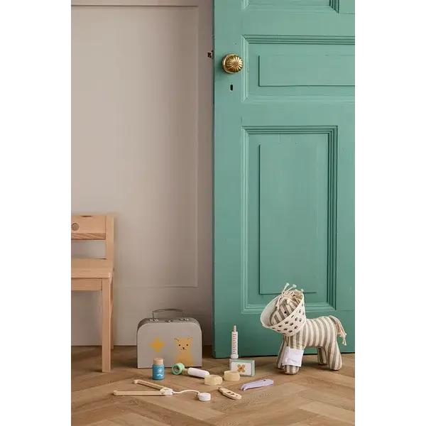 - Materiaal: Spuit, medicijnflesje: FSC-gecertificeerd berkenhout. Thermometer, pincet: FSC-gecertificeerd multiplex. Stethoscoop: FSC-gecertificeerd multiplex, FSC-gecertificeerd berkenhout, katoen. Otoscoop: FSC-gecertificeerd berkenhout, acryl. Doosje voor verband: FSC-gecertificeerd papier. Verband, kraag: polyester. Koffer: FSC-gecertificeerd papier, ijzer.