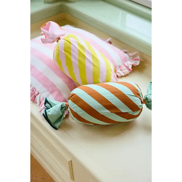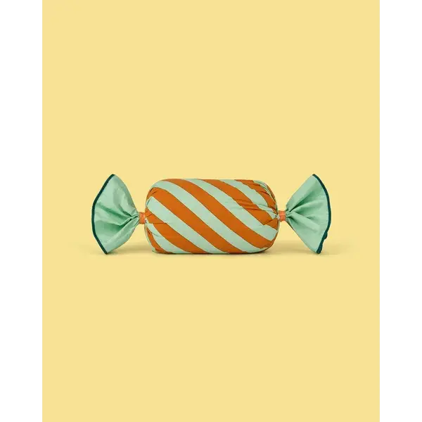 ‘Heerlijk! Heerlijk!’ ‘Wat is er zo heerlijk?’ vroeg Tommy. ‘Ik,’ zei Pippi zelfvoldaan.’ Op een zonnige lentedag trok Pippi Langkous met Tommy en Annika de stad in, haar schortzakken vol met gouden munten. Ze had zaken te regelen — en waar kon ze beter beginnen dan bij de snoepwinkel? Achttien kilo snoep later, plus een karretje om alles naar huis te slepen, kon je gerust zeggen dat Pippi haar stempel had gedrukt. Dit kussen ontleent zijn vorm aan diezelfde gedraaide snoepjes – een zacht, cilindervormig kussen met uiteinden die netjes zijn vastgebonden als een ingepakt snoepje. De stoffige groene en karamelkleurige strepen doen denken aan toffee gemengd met mintsnoepjes. Het kussen is Oeko-Tex-gecertificeerd en voorzien van een onopvallende ritssluiting, zodat je de hoes er gemakkelijk af kunt halen en op 30 graden kunt wassen. Zacht en knus, het is net zo geschikt om je hoofd op te laten rusten als om de kamer op te fleuren – geen karretje nodig.