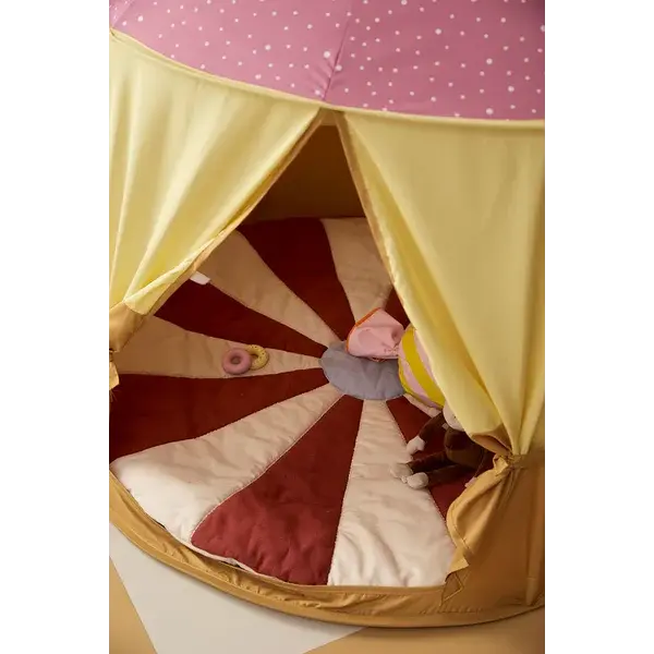 Maak van elke kamer een circuswonderland met dit grote, decoratieve, omkeerbare speelkleed – ontworpen om perfect in de Tent Circus te passen, of om op zichzelf te gebruiken waar een zachte ondergrond nodig is. Het Circus-speelkleed is gewatteerd en gevuld met gerecycled polyester, en bekleed met zachte katoenen stof. De voorkant heeft een opvallend, grafisch streepjespatroon geïnspireerd op circusthema’s, terwijl de achterkant effen gebroken wit is. Hij is ook prima op zichzelf te gebruiken – op de slaapkamervloer om op te spelen, als ondergrond voor een babygym of in de woonkamer voor een rustig leeshoekje. Let op: u kunt een antislipmat gebruiken als de mat op een gladde vloer wordt gelegd voor oudere kinderen, maar gebruik deze niet voor baby's die kruipen, zitten of liggen. De mat is machinewasbaar op 40 °C en OEKO-TEX-gecertificeerd.