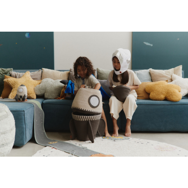 Binnenin vind je een mini-astronautenspeeltje van textiel, klaar om het schip te besturen en aan kosmische avonturen te beginnen!